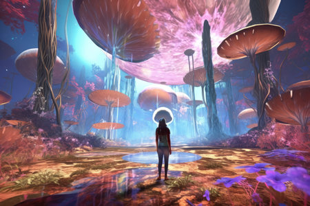 Fantasy scene with a woman standing on a wooden bridge in the middle of a fantasy world
