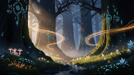 Enchanted forest glows with luminescent mushrooms, serene stream, and magical flora under a twilight canopy