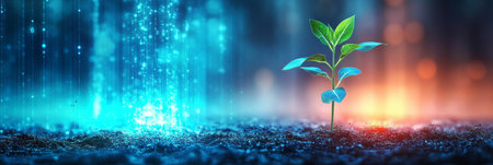 Small Plant Grows in Dirt with a Technology Background, Hope, Innovation, Sustainable Future Concept