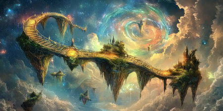 A surreal dreamscape with floating islands connected by glowing bridges. The sky is filled with swirling colors and stars, creating a fantastical and otherworldly setting.
