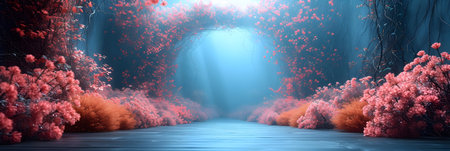 A captivating image of a forest with vibrant pink flowers, lush green ferns, and a soft, ethereal light filtering through the trees, creating a magical atmosphere.