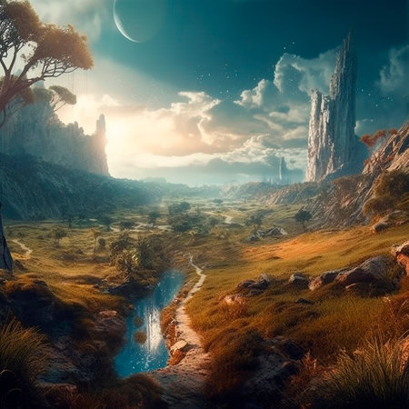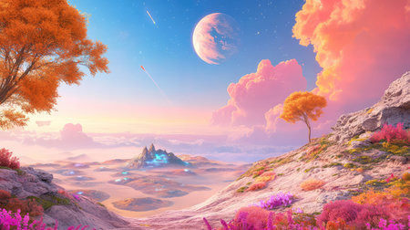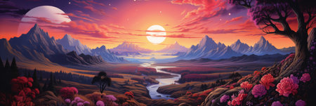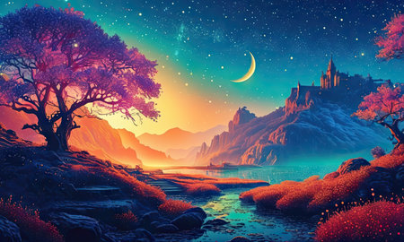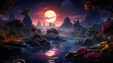 An AI generated illustration of a vibrant and colorful landscape with a full moon in the sky