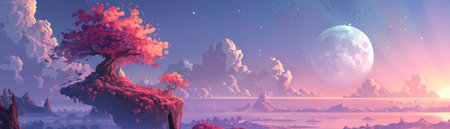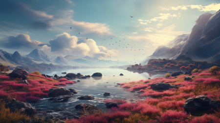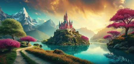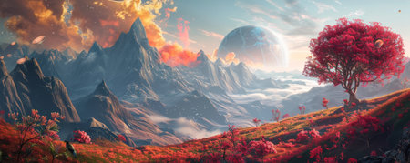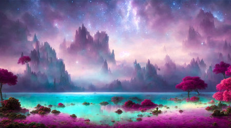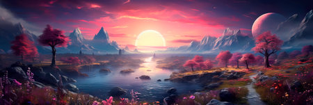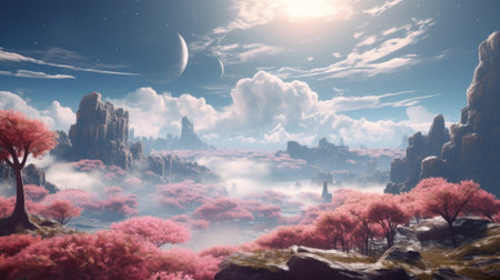 Beautiful fantasy landscape with pink flowers and mountains.
