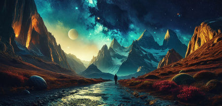 Fantasy alien planet. Mountain landscape with stars and nebula.