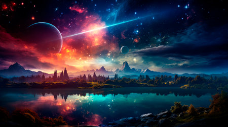 Beautiful landscape of fantasy planet. Surreal world with beautiful nebula, shining stars and shimmering sea surface.