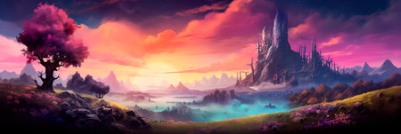 fantasy landscape with a gradient background of magical colors, sense of enchantment and wonder. Generative AI