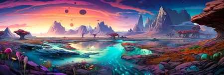 Digital CG Artwork, Concept Illustration, Cartoonish Style Background of an Alien Planet.