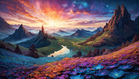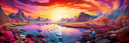 Beautiful fantasy landscape with a river and mountains at sunset.