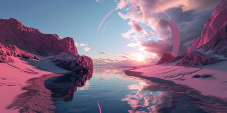 Fantasy landscape with lake and mountains at sunset. 3d illustration