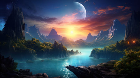 Fantasy landscape with mountains and lake at night.