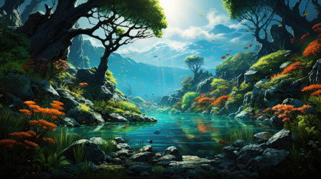 An AI generated illustration of a scenic view of a mountainous landscape with a flowing stream, lush trees, and diverse mushrooms