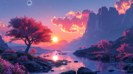 An AI generated illustration of A serene outdoor scene featuring a pink and orange sky as the sun sets behind a mountain with a tree in the foreground