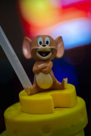 Samut Prakan, Thailand - July 7, 2020 : Plastic drink cup Tom and Jerry to promote the movie of Tom and Jerry. Advertising Major Cineplex Group Plc. Operates the largest cinema in Thailand.
