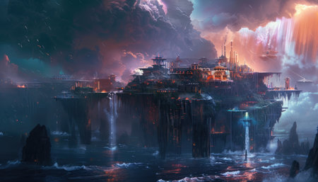 A futuristic city built on towering cliffs with dramatic clouds and waterfalls, creating a vibrant and fantastical landscape.
