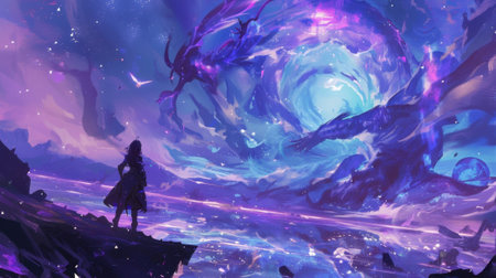 A woman stands with her profile illuminated, surrounded by swirling colors and light, creating an ethereal atmosphere filled with cosmic energy and dreamlike elements.