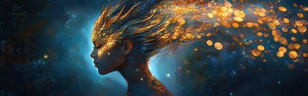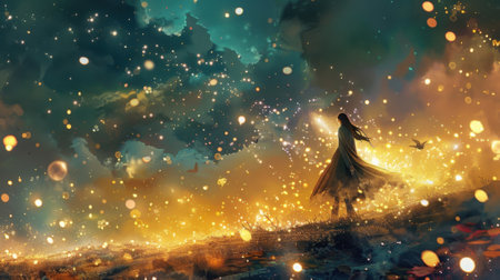 A woman radiates a mystical glow, her flowing hair transformed into ethereal streams of color resembling a cosmic landscape. A starry night enhances the enchanting atmosphere.