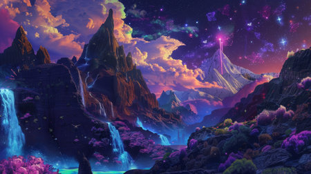 A technologically-charged metaverse. Landscape with science fiction mountains, rivers and clouds.