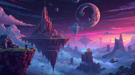 Surreal dreamscape with floating islands and futuristic cityscapes backdrop
