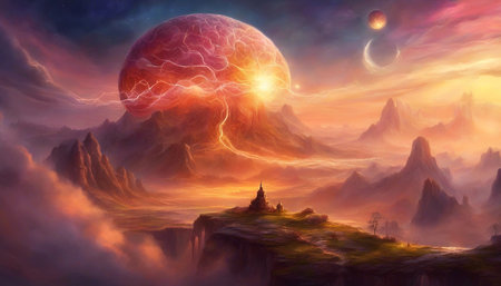 Fantastical floating landscape with dramatic colorful celestial skies glowing planets and a levitating bridge amid surreal dreamlike flora Imaginative visionary digital
