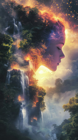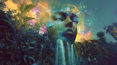A tranquil waterfall cascades through lush greenery while an ethereal face emerges from vibrant colors and light, blending nature with mystical artistry in a captivating display.