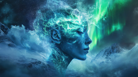 A mystical figure emerges within a landscape, illuminated by vibrant northern lights. Snow-capped mountains frame the scene, creating a surreal atmosphere at night.