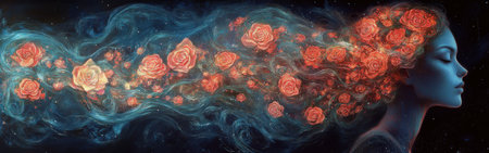 A woman's silhouette is illuminated against a deep night sky, her flowing hair filled with vibrant roses. The ethereal scene conveys a sense of mystery and beauty, evoking feelings of tranquility.