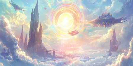 Fantastical Daytime Sky with Rainbow Clouds, Floating Airships, and Winged Creatures