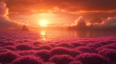 A breathtaking view of a vibrant sunset over a sprawling field of purple flowers, with a serene body of water reflecting the colorful sky and distant mountains.