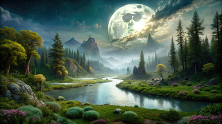 Fantasy landscape with mountain river and forest on the background of the moon