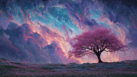 This enchanting image features a solitary pink tree against a stunning cosmic sky filled with vibrant colors and celestial clouds. A visual celebration of nature and the universe.