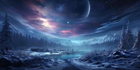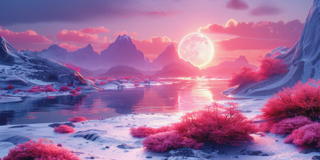 Surreal alien landscape with pink trees and a giant moon over a mystical frozen lake, perfect for fantasy and sci-fi illustrations. With Generative AI technology.