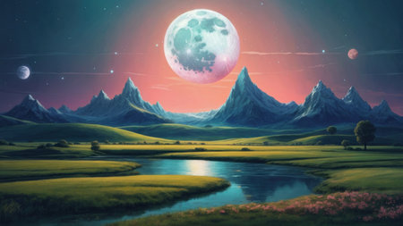 a landscape with a river and mountains and a moon