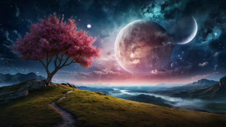A vibrant pink tree stands tall on a hilltop under a sky filled with swirling nebulae and celestial bodies.