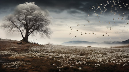 Landscape with a lonely tree in the middle of a foggy lake