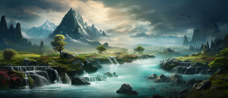 Fantasy landscape with a waterfall and mountains in the background. Digital painting.