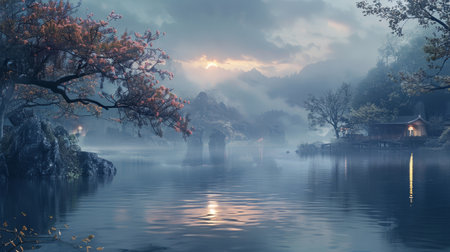 Ethereal Morning Fog Over Lake with Sunlit Ancient Trees in Mystical Atmosphere