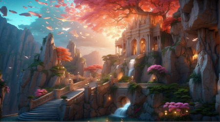 3d illustration of a fantasy landscape with a waterfall and a temple