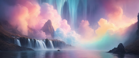 mystical waterfall pouring from a celestial mountain amidst a swirling, ethereal abstract landscape. Generative AI