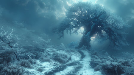 Fantasy landscape with a sacred tree in the mountains. 3D rendering