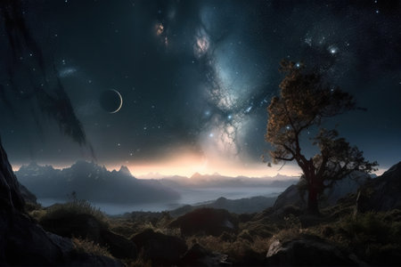 A vibrant tree emits a radiant glow against a backdrop of majestic mountains. The starry sky twinkles with brilliance, creating a dreamlike atmosphere.