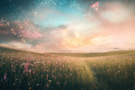 A peaceful meadow filled with colorful wildflowers under a stunning twilight sky, showcasing stars and vibrant clouds.