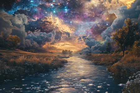 A serene river flows through lush landscapes beneath a vivid sunset and twinkling stars.