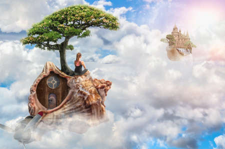 Fantasy castle floating in the sky. Mixed media. Mixed media