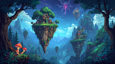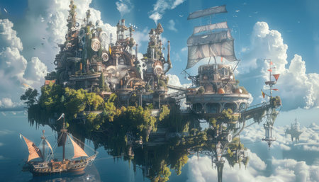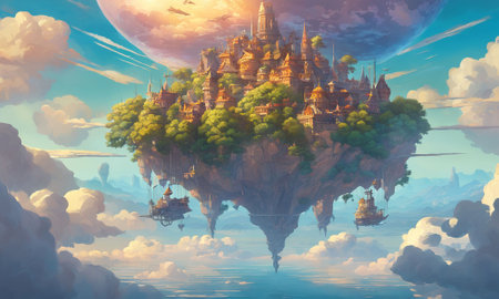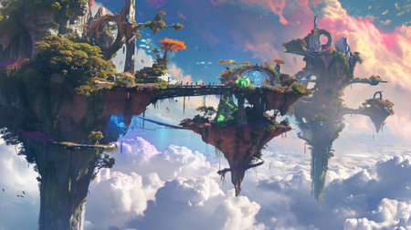 Vibrant floating islands in the sky, with fantastical flora and fauna