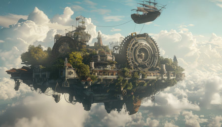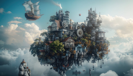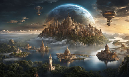 Surreal dreamscape with floating islands and futuristic cityscapes backdrop