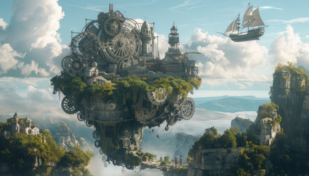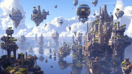 Explore a breathtaking futuristic cityscape featuring floating islands and skyships against a vibrant blue sky. A perfect blend of nature and technology.