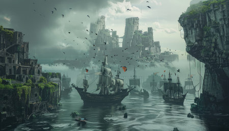 A fleet of ships sails through a misty harbor, surrounded by towering, rocky cliffs and ancient ruins.