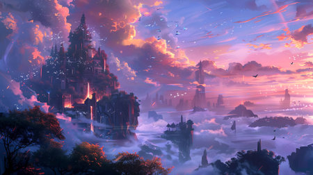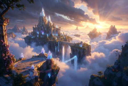 Enchanting fantasy scene showcases a grand castle in the clouds, illuminated by sunset hues, with floating islands and rich foliage creating a magical atmosphere, AI generated