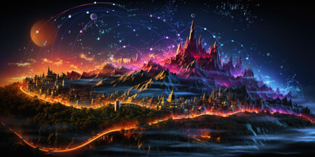 A digital painting of a city on a mountain. Digital image. Surreal digital landscape, big data.