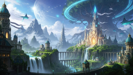 Fantasy landscape with fantasy castles and waterfalls. Digital painting.